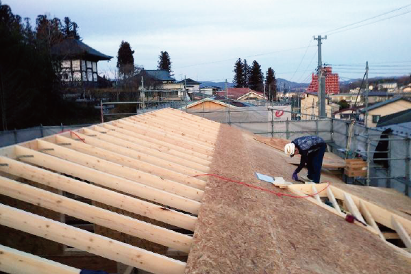 木造住宅の建物内部の下地を作り上げていく工事をいいます。木材パネルを屋根部分や外壁部分に加工・取付を行い、完成する建物をイメージしながら工事を行います。